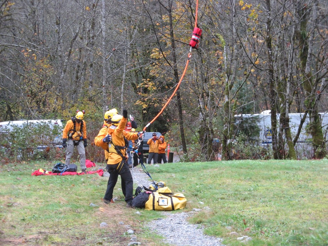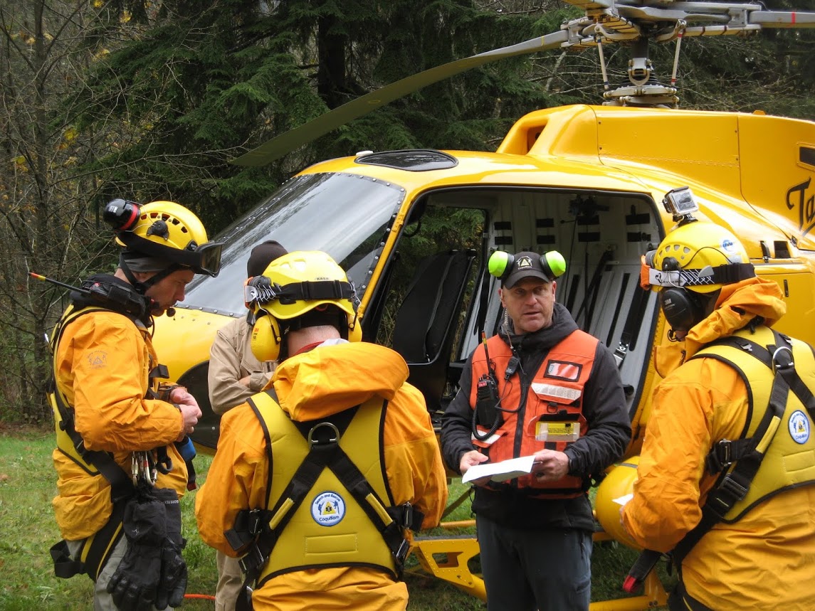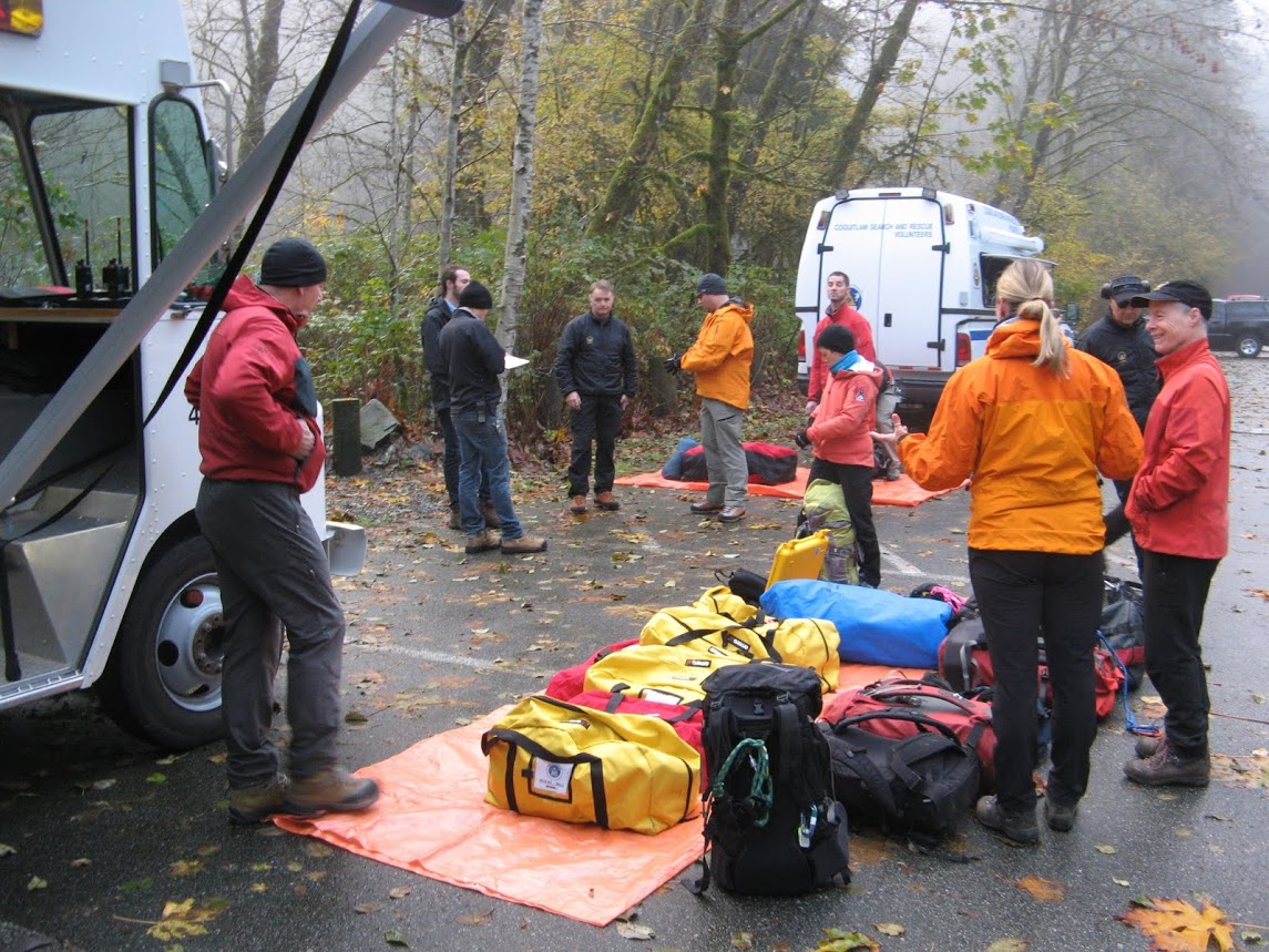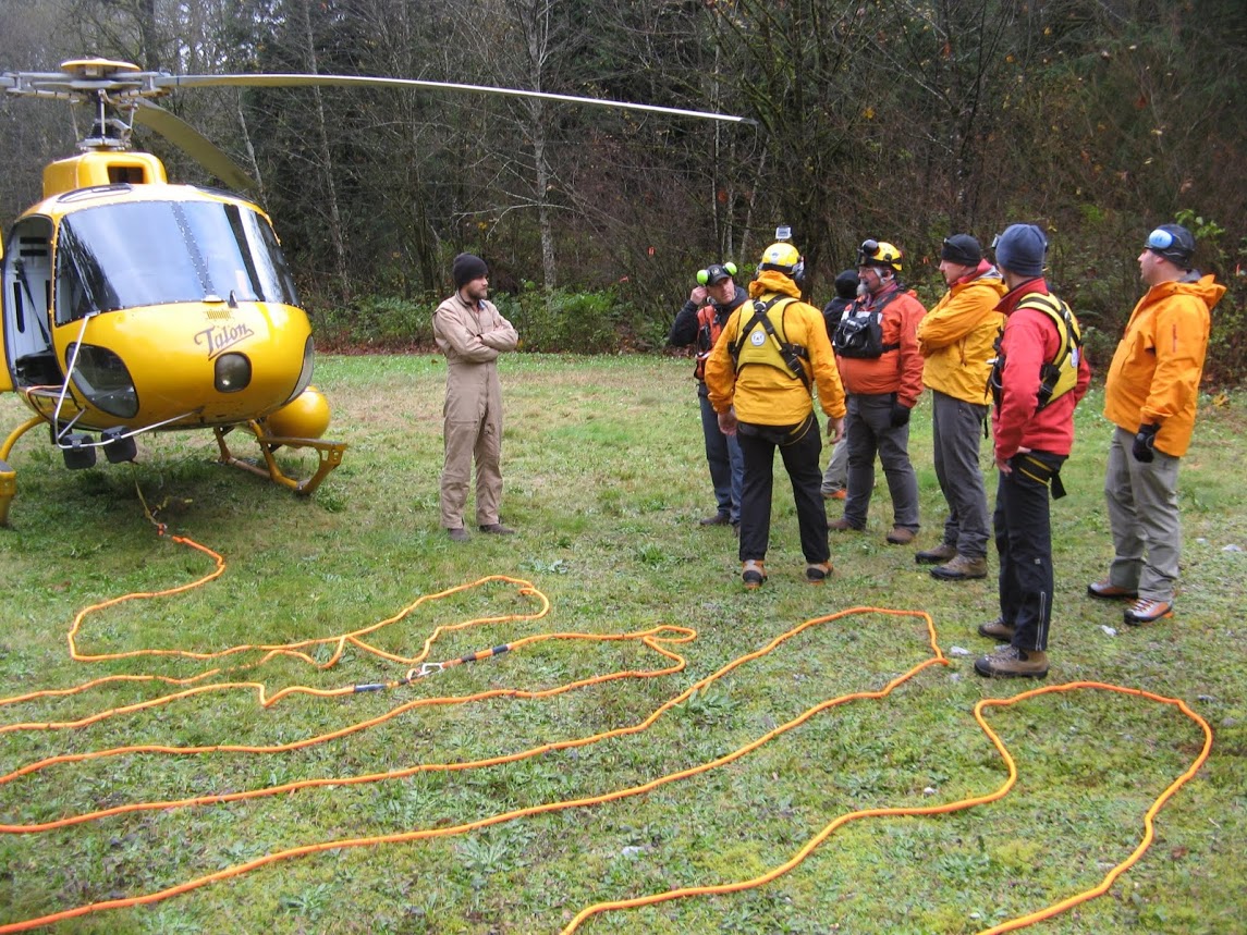Coquitlam SAR members gathered in uncertain weather at Buntzen Lake this Sunday for a helicopter long line rescue training event.
