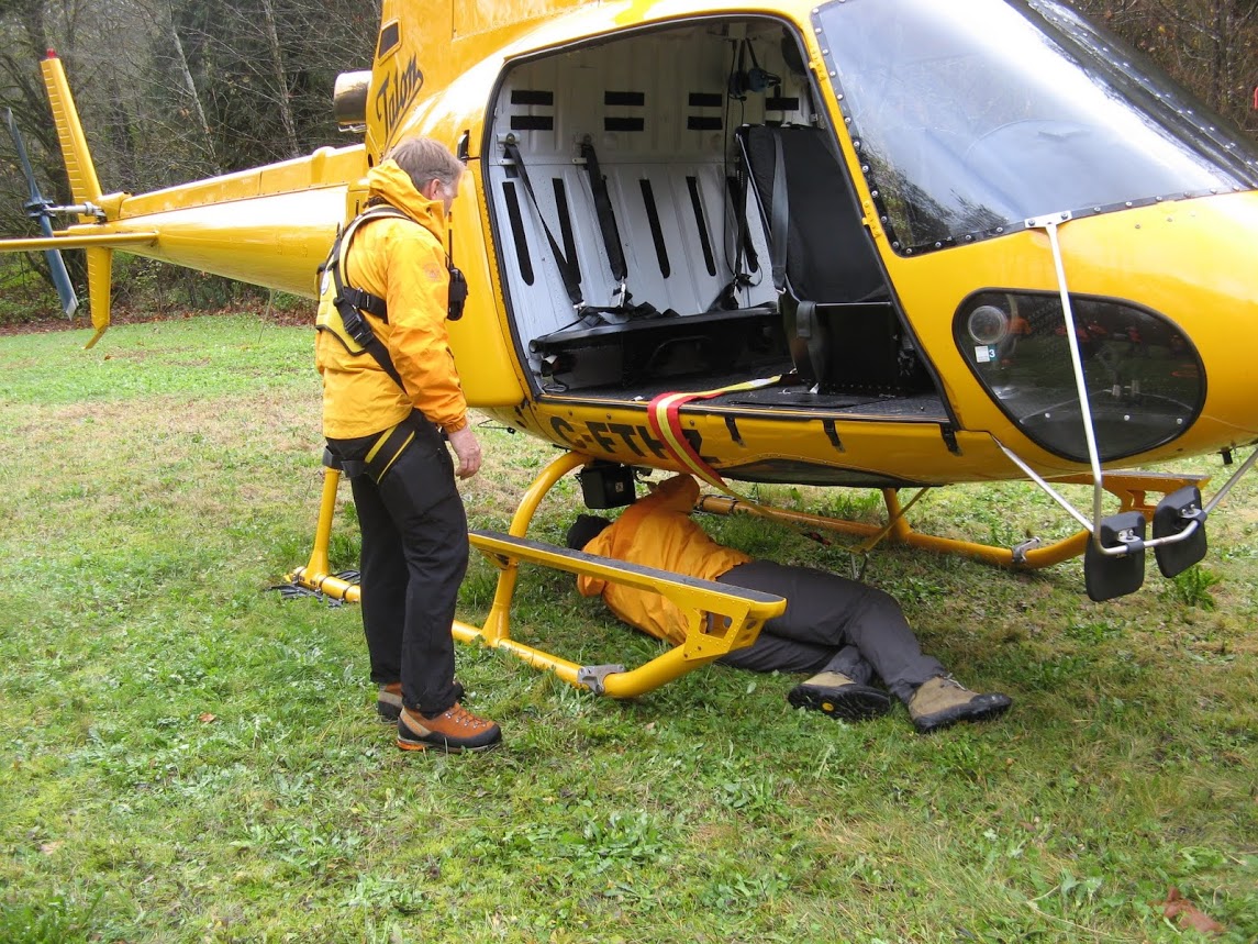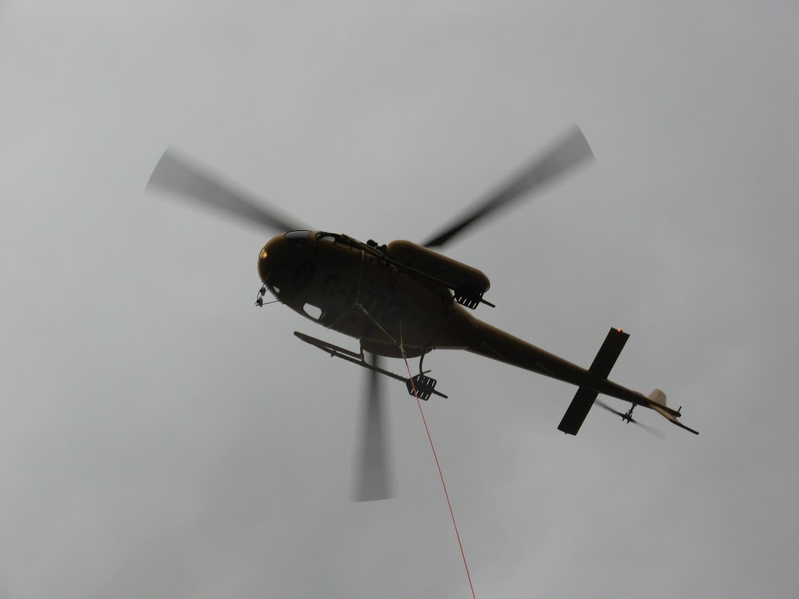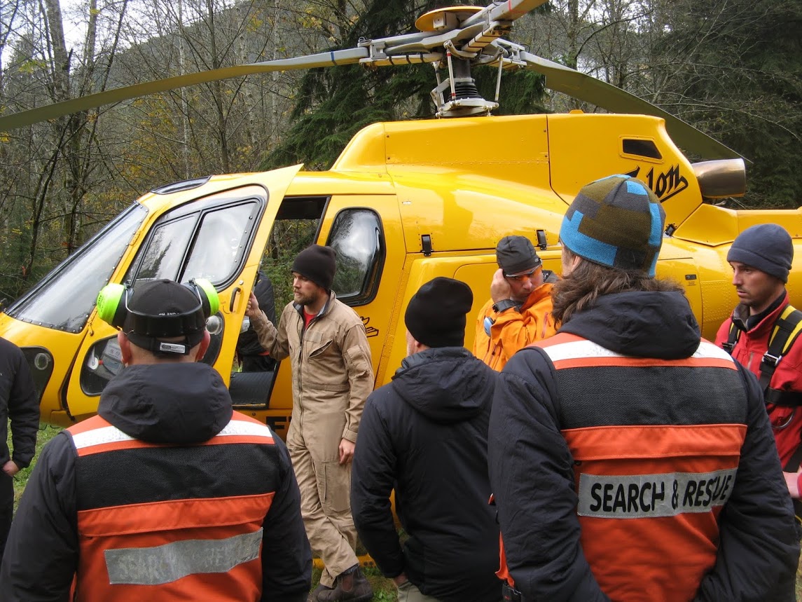 Two teams of SAR members ascended the Halvor Lunden trail, and the Diez Vista trail to the Polytruchum and Punta Del Este lookouts respectively, the goal being to do two scenarios on trails that have historically been the busiest areas for the team, Meanwhile, Talon Helicopters pilot Jarrett Lunn arrived, only to find the area fogged in. After waiting a 45 minutes, he was finally able to set down under patchy blue skies.